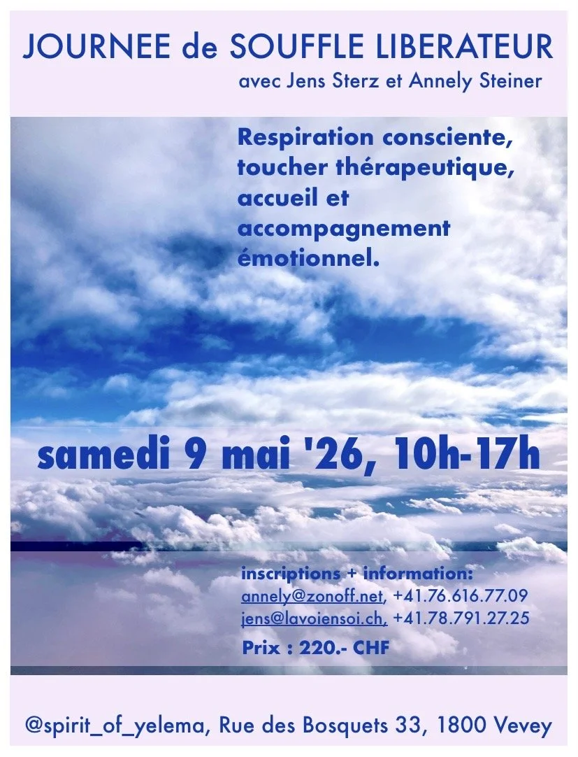 Les thérapeutes présent.e.s (Jens Sterz et moi) et leurs assistant.e.s ont de nombreuses années d’expérience et partagent leur art de libération… par le souffle, le toucher et la parole!
